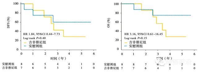 图2 总人群中吉非替尼组和安慰剂组的DFS(A)和OS(B)比较
